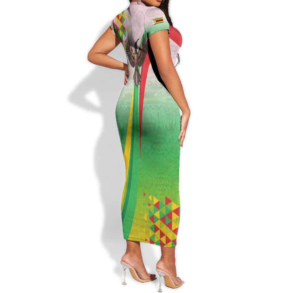 Vibe Zimbabwe Short Sleeve Bodycon Dress Tribal-Inspired Background with Geometric Flag Color Design