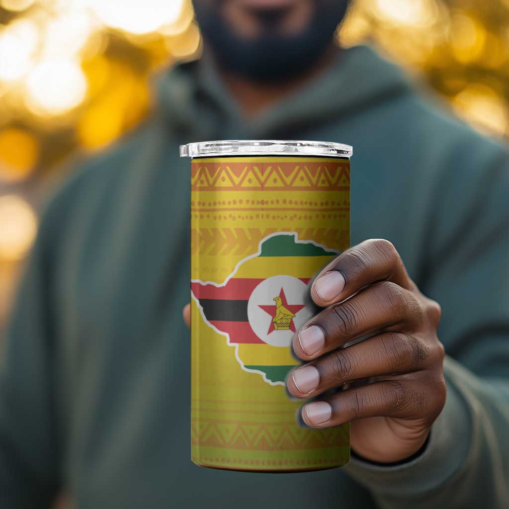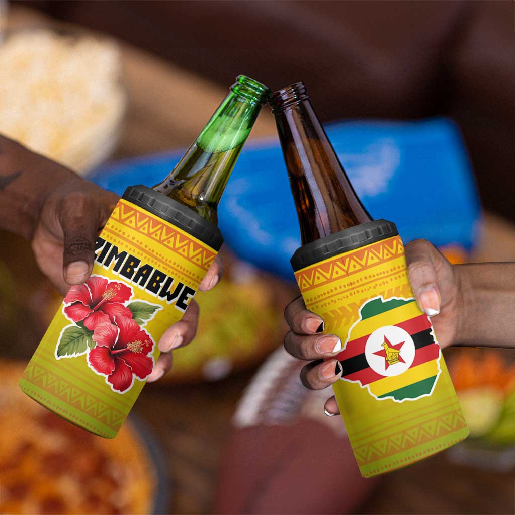 Zimbabwe Flag Map 4 in 1 Can Cooler Tumbler African Tribal Pattern Red Hibiscus Flowers