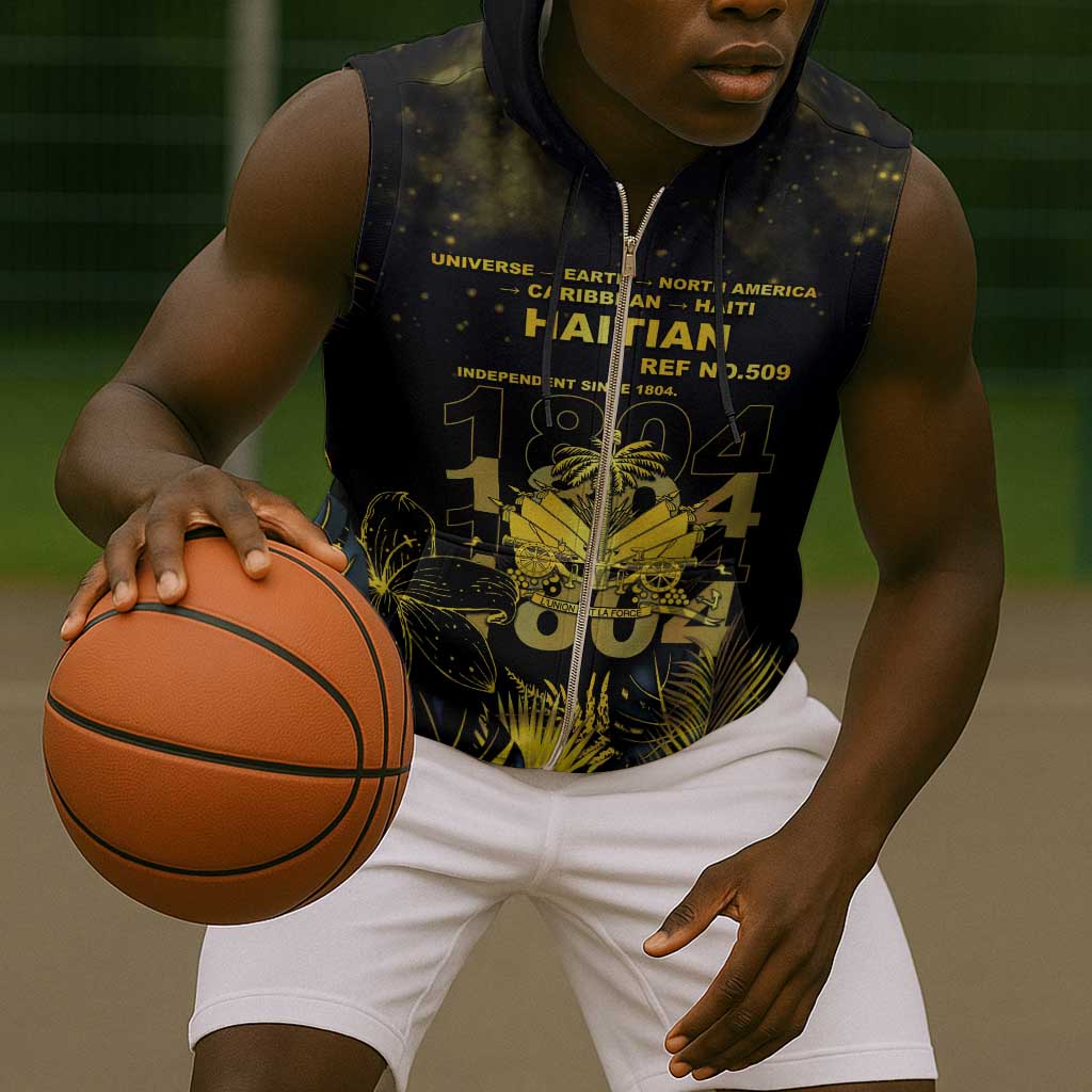 Haiti 1804 Sleeveless Zip Hoodie Gold Tropical Leaves And Coat Of Arms