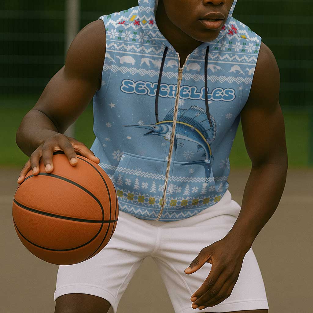 Seychelles Christmas Sleeveless Zip Hoodie Ocean Blue Marlin Fish Artwork and Surfing Santa Motif