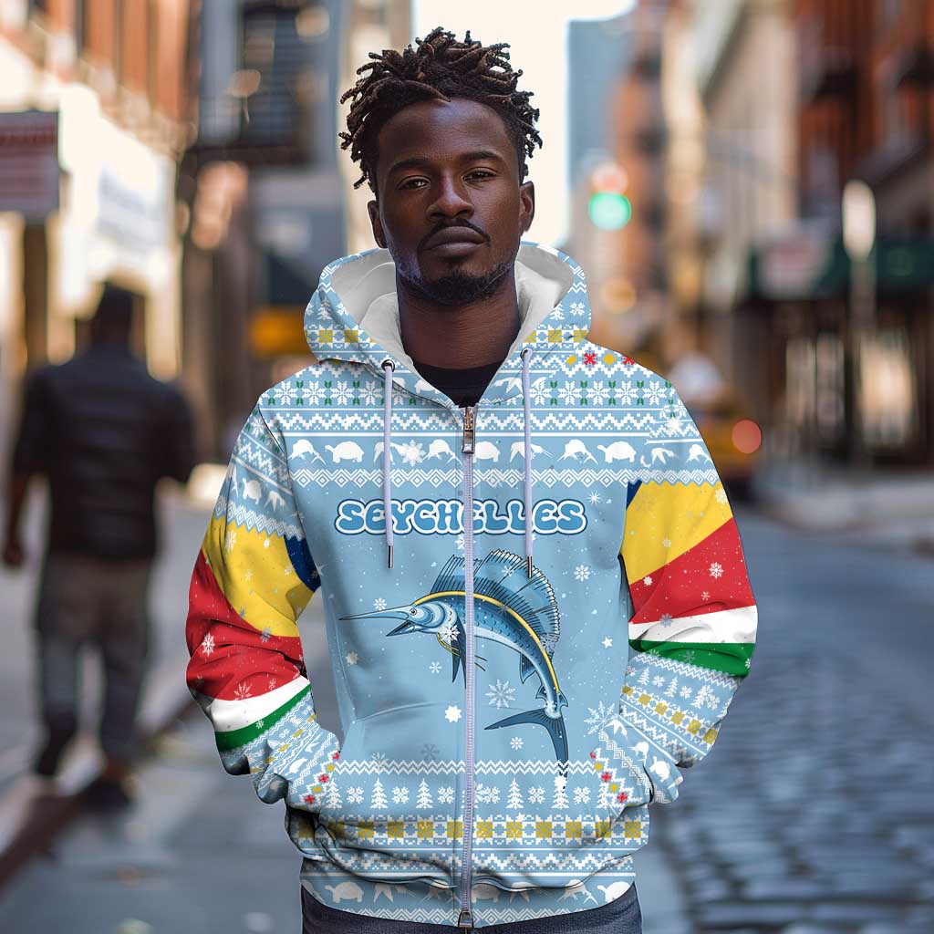 Seychelles Christmas Zip Hoodie Ocean Blue Marlin Fish Artwork and Surfing Santa Motif