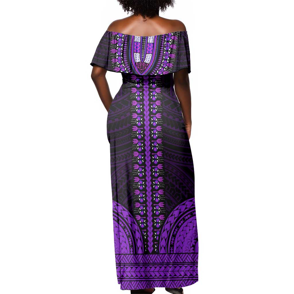 African Dashiki and Polynesian Pattern Off Shoulder Maxi Dress Purple