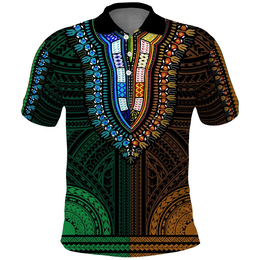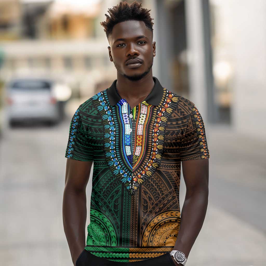 African Dashiki and Polynesian Pattern Polo Shirt Half Green-Gold