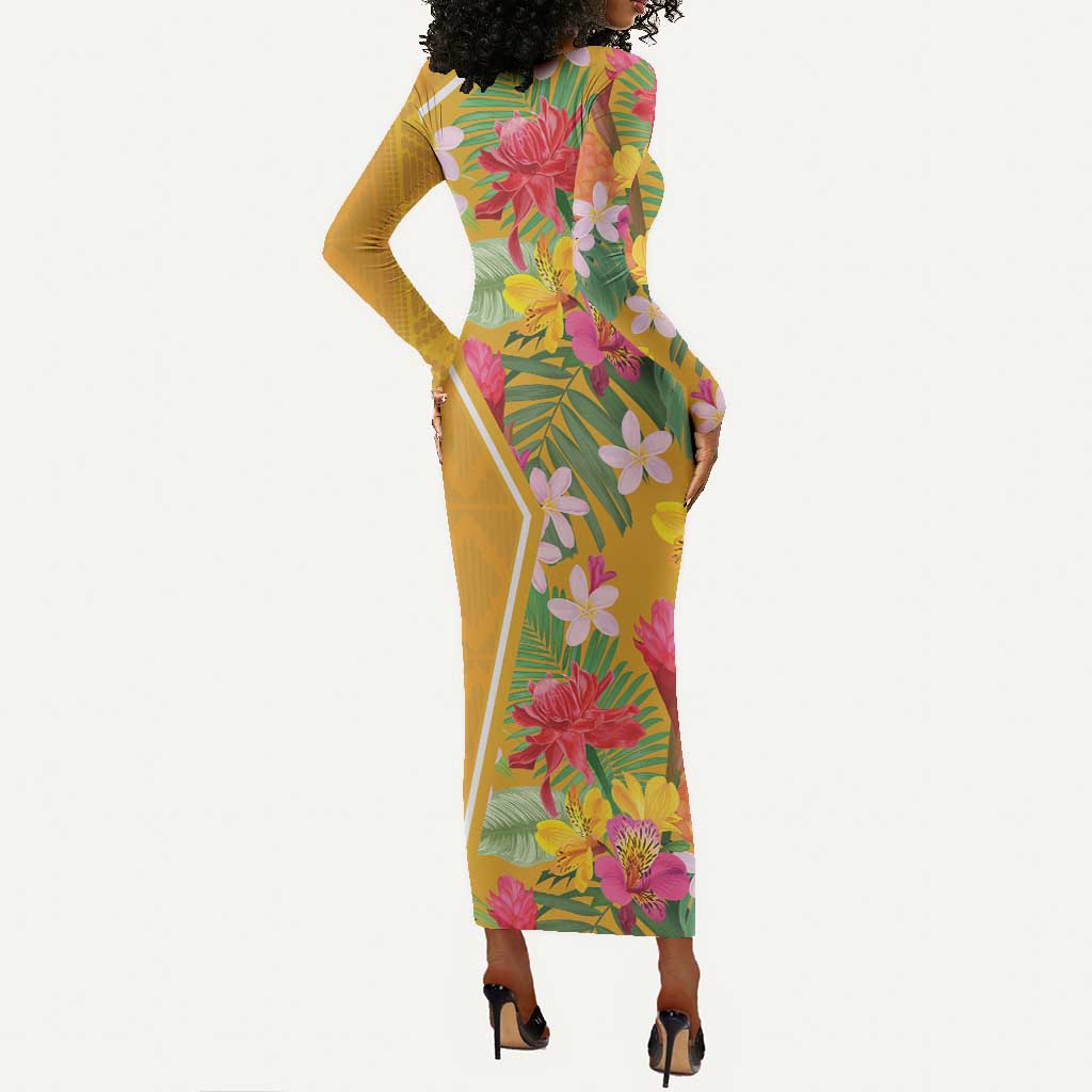Afro Tropical Flowers Long Sleeve Bodycon Dress Yellow Version