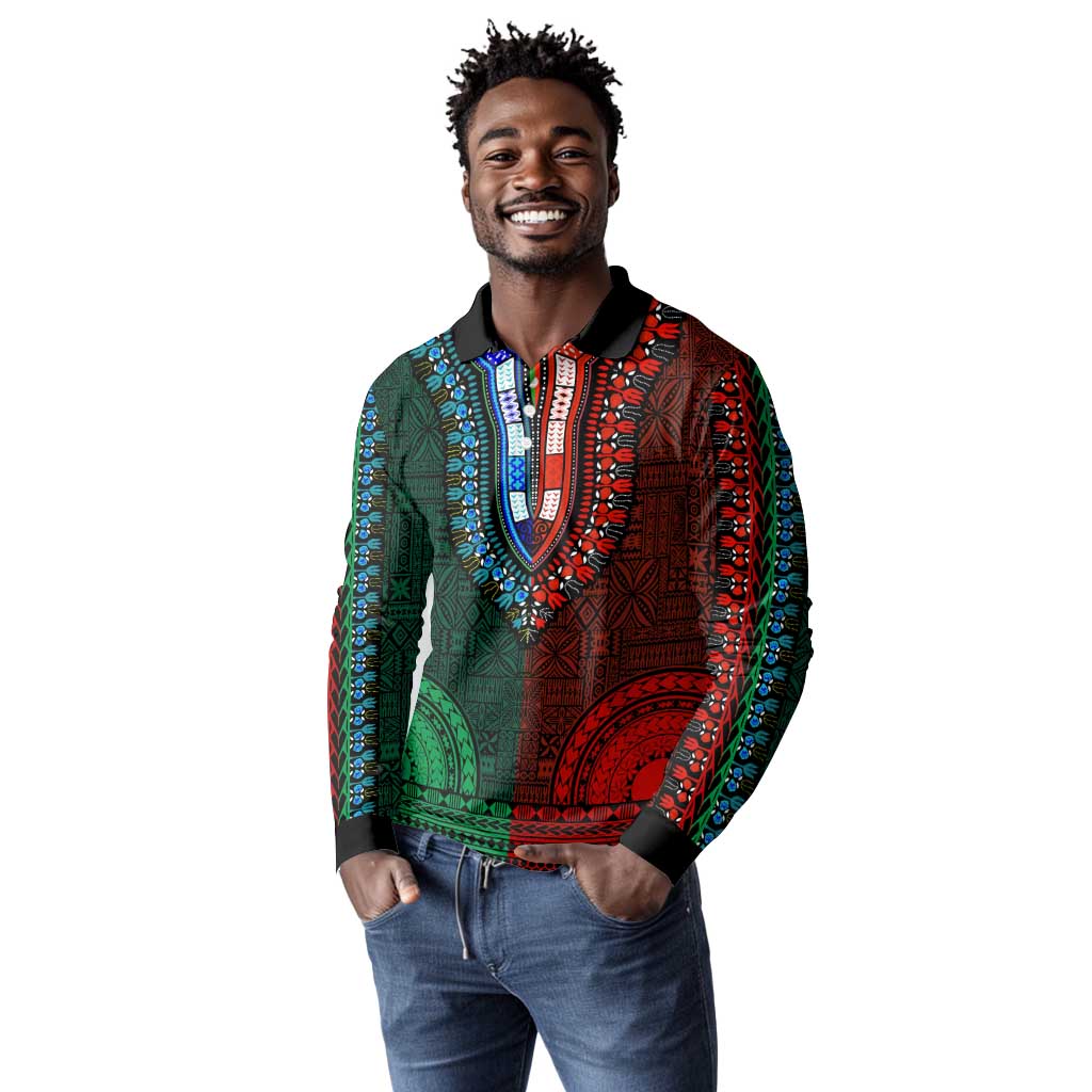 Green-red Dashiki and Tapa Pattern Long Sleeve Polo Shirt Africa-Polynesia Together Culture