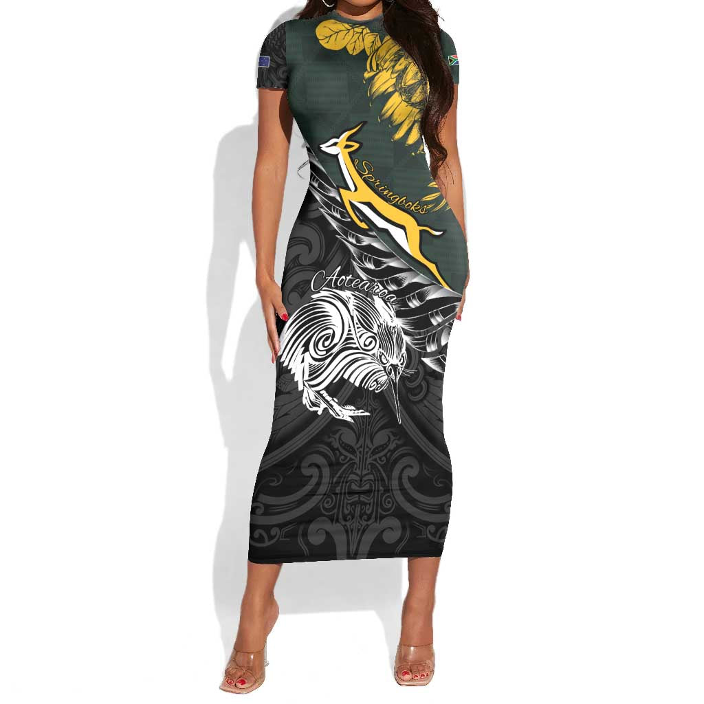 New Zealand vs South Africa Rugby Personalised Short Sleeve Bodycon Dress Maori Kiwi With Springboks