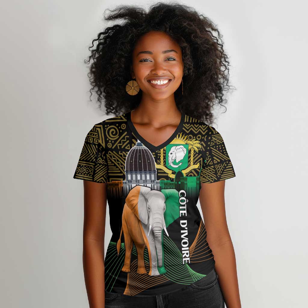 Personalized Cote dIvoire Independence Day Women V-Neck T-Shirt Ivory Coast Elephant African Pattern