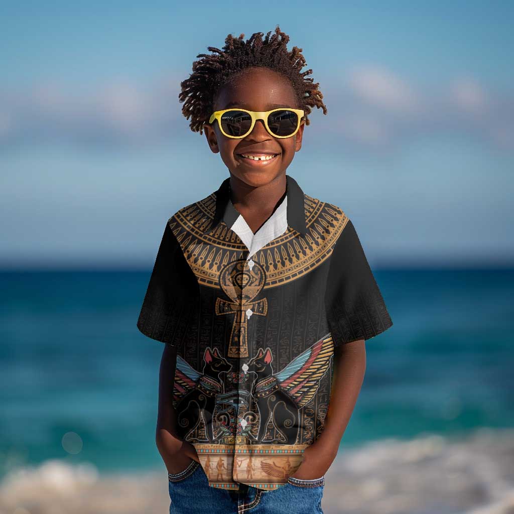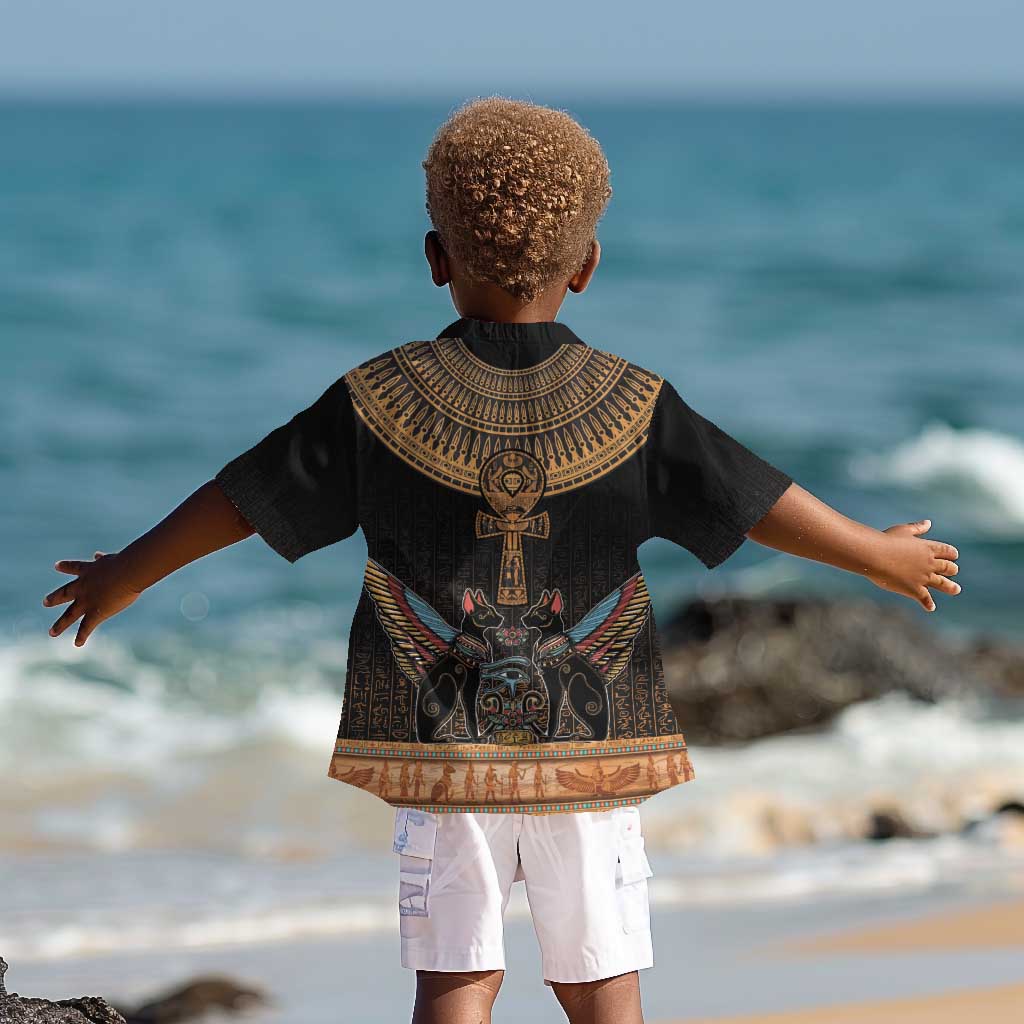 Winged Egypt Cats Kid Hawaiian Shirt Hieroglyphs Alphabet Pattern